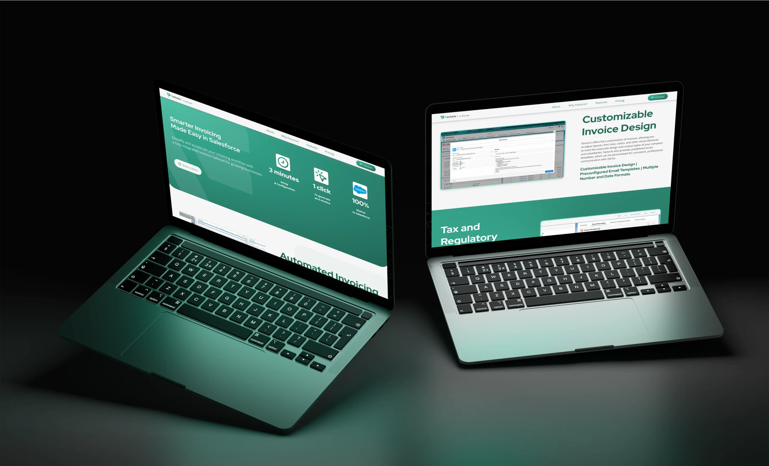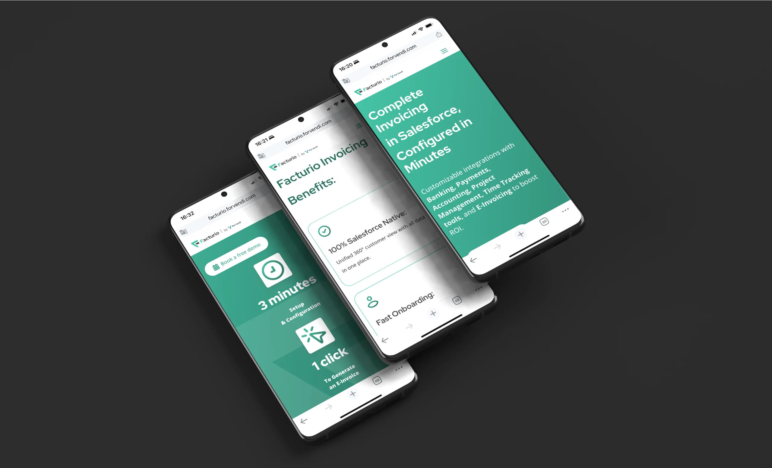 Projekt strony internetowej Facturio został oparty na prostocie i klarowności, aby w intuicyjny sposób prezentować możliwości aplikacji. Postawiliśmy na przejrzystą architekturę informacji, nowoczesny UX/UI i czytelny język korzyści. Podkreśliło to główne zalety produktu, czyli krótki czas wdrożenia, zgodność z regulacjami i wygodę użytkowania. Dzięki temu strona pełni rolę zarówno wizytówki marki, jak i narzędzia sprzedażowego, wspierając jej obecność w międzynarodowym ekosystemie Salesforce.